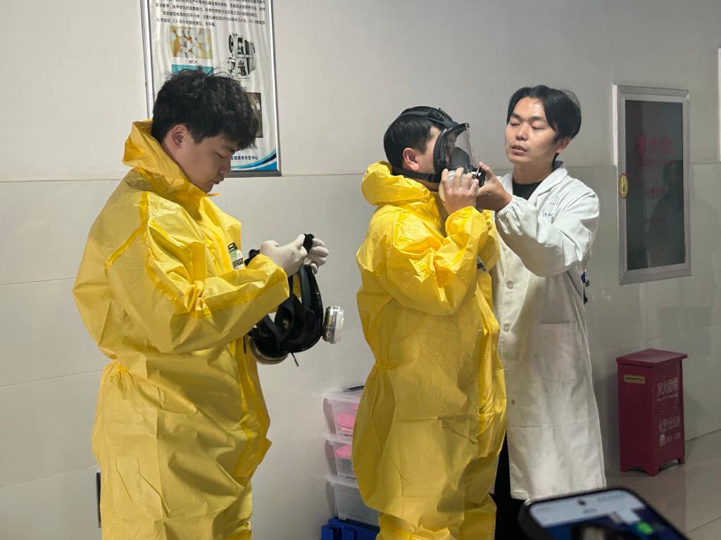 下午3时整,演练正式启动。“报告!1421实验室发生浓盐酸泄漏,约500mL,有同学皮肤不慎接触,现场有刺鼻气味!”一名正在进行实验操作的员工发现泄漏后,立即按照实验室安全规范,大声警示周边同学,并迅速向实验室安全责任老师报告。
